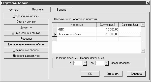 Ввод данных о пассивах предприятия обычно начинается с причитающихся к уплате налогов (имеются в виду налоговые обязательства предприятия, образовавшиеся до начала проекта, но которые необходимо погашать в период реализации проекта). Любое действующее предприятие имеет текущие обязательства по налогам, и эта информация вводится на вкладке Отсроченные налоги (рис. 4.27).