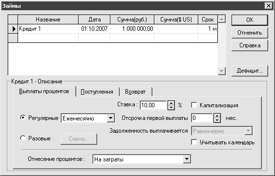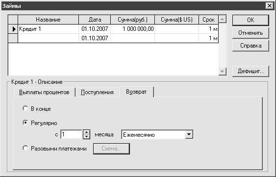 Завершается ввод данных о задолженности по кредитам на начало проекта нажатием кнопки ОК. Кнопка Отменить предназначена для выхода из данного режима без сохранения выполненных изменений.