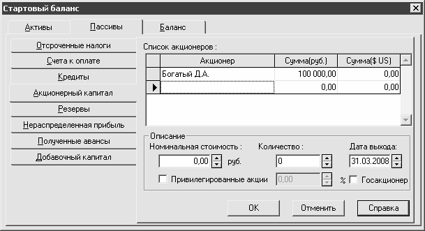 В нижней части вкладки отображается информация, относящаяся к активной позиции списка. В поле Количество указывается количество акций, находящихся на руках у акционера, а в поле Номинальная стоимость – их стоимость по номинальной цене. Установка флажка Привилегированные акции указывает на то, что владелец данного пакета получает гарантированный доход. Величина дохода вводится в расположенном справа поле в процентах годовых от номинала акций.