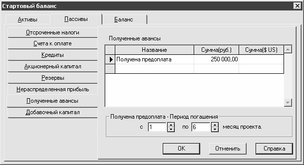 На вкладке Полученные авансы отражается информация о суммах, полученных предприятием от контрагентов в счет будущих поставок продукции (иначе говоря, здесь вводятся суммы полученных предоплат) по состоянию на дату начала проекта. Содержимое вкладки показано на рис. 4.31.