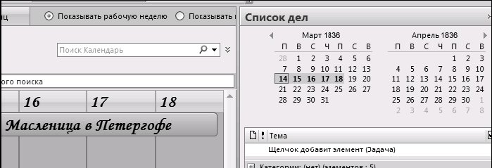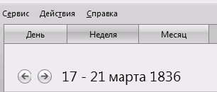 2. На панели задач выберите пункт «Неделя». Календарь приобретет такой же вид, как у Евгения Онегина: по горизонтали – дни, по вертикали – часы.