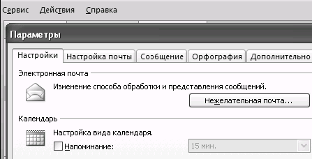 4. В меню Сервис / Параметры на вкладке «Настройки» снимите галочку у слов «Напоминание: 15 минут». Это нужно для того, чтобы вас не утомляли напоминания обо всех без исключения встречах.