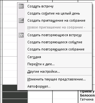 6. Чтобы создать многодневное событие, выделите мышкой время не на календаре, а на голубой (в версии 2003 – серой) полосе над ним. Кликните на выделенной полосе правой кнопкой мыши и выберите в контекстном меню «Создать встречу».