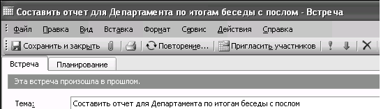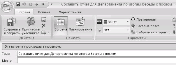 Обратите внимание на то, что в Outlook 2003 окно создания встречи выглядит несколько иначе: