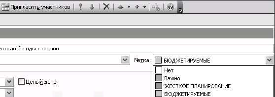 Обратите внимание, что в Outlook 2007 исчезло понятие «Метка», которое используется в Outlook 2003, и цвет теперь имеют сами категории (это важное новшество). В версии 2003 цвет выбирается в поле «Метка» окна создания встречи.