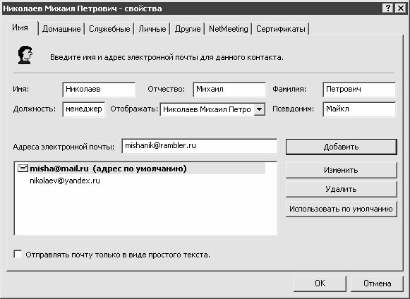 По умолчанию для данного контакта будет использоваться электронный адрес, который был введен первым. Однако впоследствии его можно изменить. Для этого необходимо выделить в списке адресов тот адрес, который должен использоваться по умолчанию, и нажать кнопку Использовать по умолчанию, которая расположена справа от списка адресов. На рис. 2.13 в качестве используемого по умолчанию адреса выбран адрес misha@mail.ru.