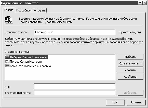 Как отмечалось выше, адресатов целесообразно объединять в группы. Для создания новой группы необходимо в главном окне адресной книги (рис. 2.12) выполнить команду главного меню Файл?Создать группу либо команду контекстного меню Создать?Создать группу (эти команды вызываются также нажатием комбинации клавиш Ctrl+G). В результате на экране откроется окно, изображенное на рис. 2.14.