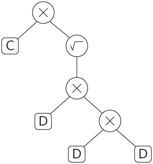 Например, представьте, что вы хотите вывести программу, вычисляющую длину года на некой планете (T) на основе ее расстояния от солнца (D). По третьему закону Кеплера, T — это квадратный корень из D в кубе, умноженный на постоянную C, которая зависит от используемых единиц времени и расстояния. Генетический алгоритм должен уметь работать на основе данных Тихо Браге о планетарных движениях, как когда-то сам Кеплер работал. В подходе Коза D и C — это листья программного дерева, а операции, которые их соединяют, например умножение и извлечение квадратного корня, — это внутренние узлы. Вот программное дерево, которое правильно вычисляет T: