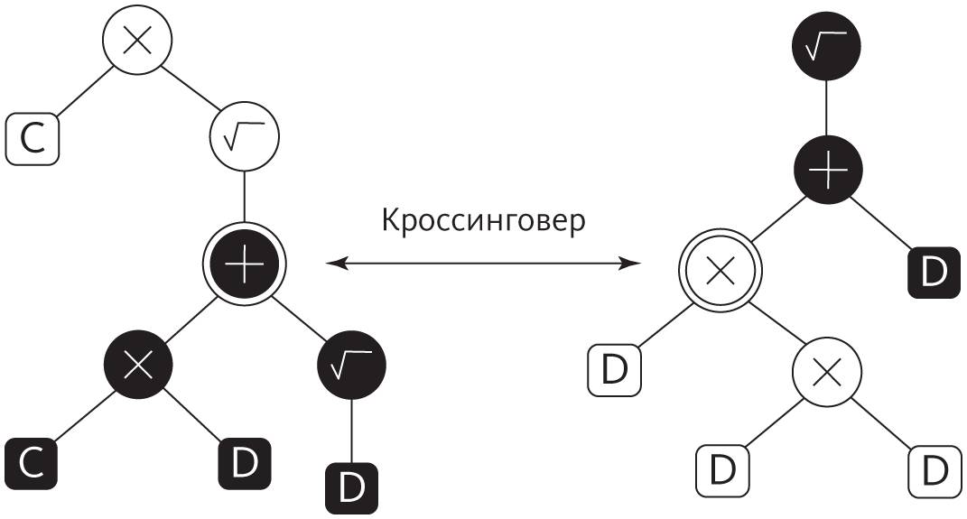 Одним из самых выдающихся студентов Холланда был Джон Коза[78]. В 1987 году он возвращался на самолете в Калифорнию с конференции в Италии, и его озарило: почему бы не получать путем эволюции полноценные компьютерные программы, а не сравнительно простые вещи вроде правил «Если…, то…» и контроллеров газопроводов? А если поставить себе такую цель, зачем держаться за битовые строки как их представление? Программа на самом деле — дерево обращений к подпрограммам, поэтому лучше непосредственно скрещивать эти поддеревья, а не втискивать их в битовые строки и рисковать разрушить отличные подпрограммы, перекрещивая их в произвольной точке.