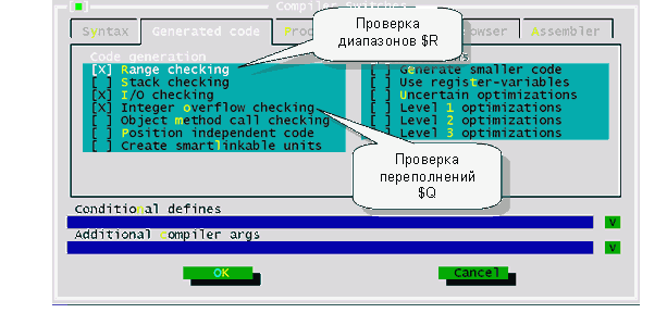 В таких случаях в Borland Pascal имеет силу директива проверки переполнения $Q+, которая соответствует флажку «Overflow Checking» в окне опций компилятора (рис. 74). Директивы $R+ и $Q+ можно применять совместно, например: