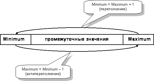 Проделав опыты с переменными других числовых типов, вы убедитесь, что переполнение и антипереполнение может постигнуть любую из них. Так, добавление единицы к положительному числу 32767 в переменной типа INTEGER дает отрицательный результат -32768. Отсюда следует общее правило: добавление единицы к максимальному значению для числового типа дает минимальное значение. И наоборот: вычитание единицы из минимального значения дает максимальное. Рис. 75 наглядно показывает это.