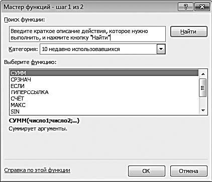 Вы можете вводить функции как в ручном, так и в автоматическом режиме. В последнем случае используется мастер функций (рис. 3.9), открываемый с помощью кнопки Вставить функцию, которая расположена на ленте Excel на вкладке Формулы.