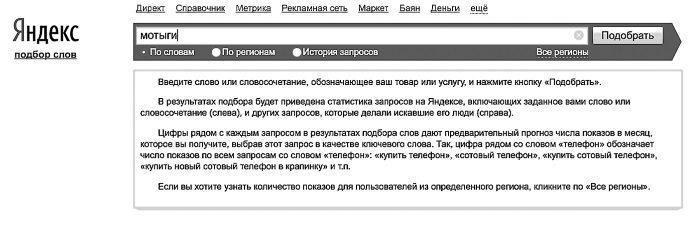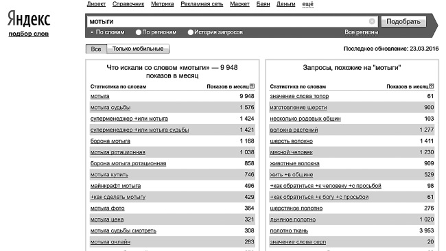 В данном случае мотыгу спрашивали 9948 раз в месяц. Это число говорит о том, что продажа мотыг через Интернет – плохая идея. Так как для более-менее успешного ведения бизнеса нужно, чтобы было хотя бы десять тысяч заходов, да и то не факт.