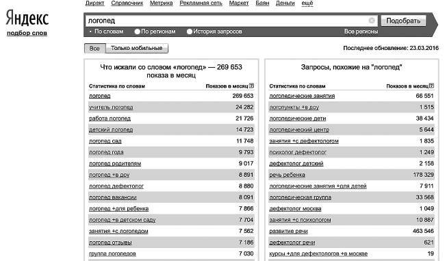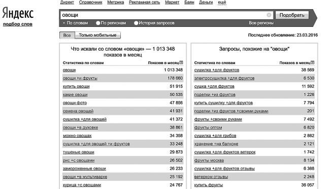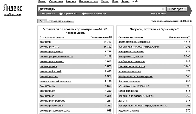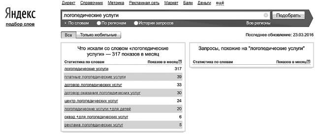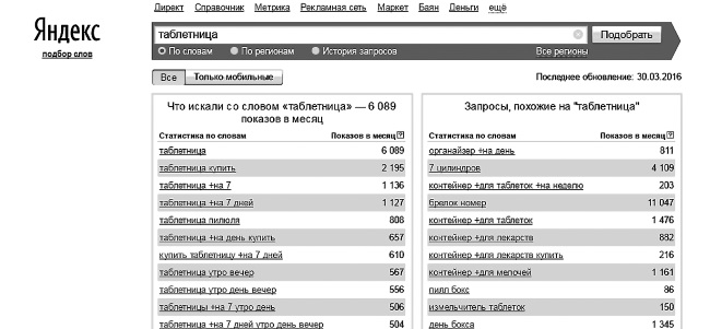 Сервис может быть полезен не только для подачи объявлений с высокой конверсией (отношение продаж к посещениям), но и для подбора оптимальных ключевых слов для продвижения отдельных страниц или целых сайтов. Вордстат позволяет узнать количество показов в разных регионах, а с недавних пор еще и учитывает долю мобильного трафика, использующего поисковик.