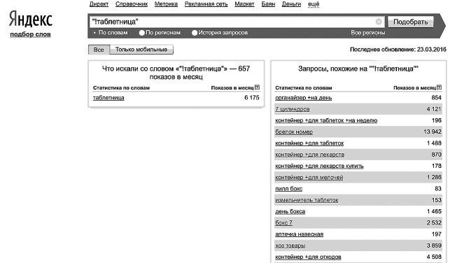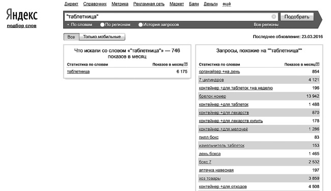 Уже хорошо. Но как же все-таки узнать количество показов для точного слова «таблетница»? Для этого добавим еще восклицательный знак перед словом.