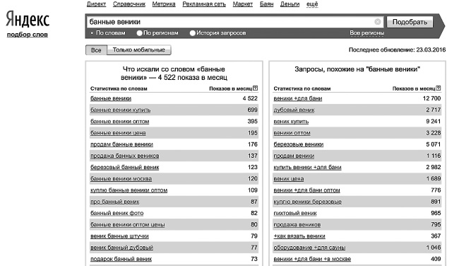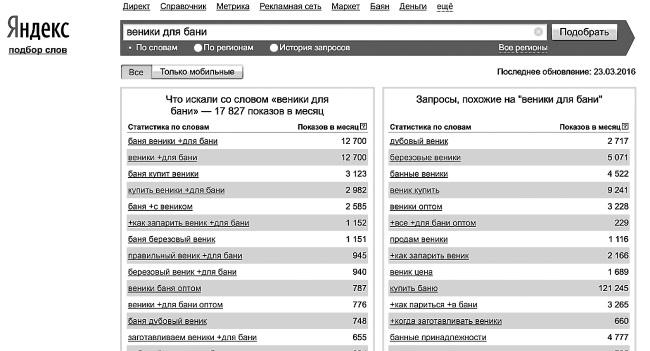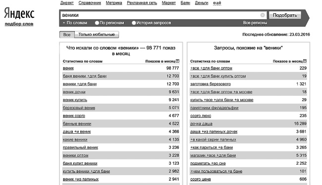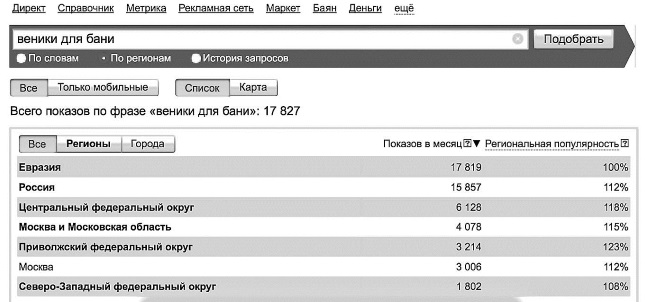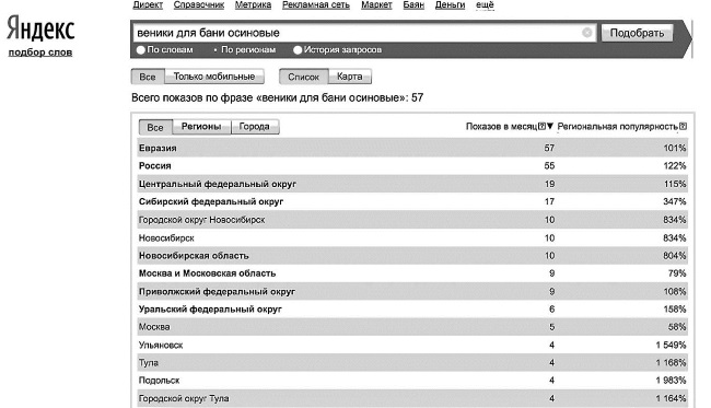 Например, если вы находитесь в Москве, то по запросу «купить веники для бани» Яндекс выдаст вам именно московские сайты. Понятно, что частота и трафик в этом регионе будут совсем иными, нежели в каком-нибудь маленьком городке.