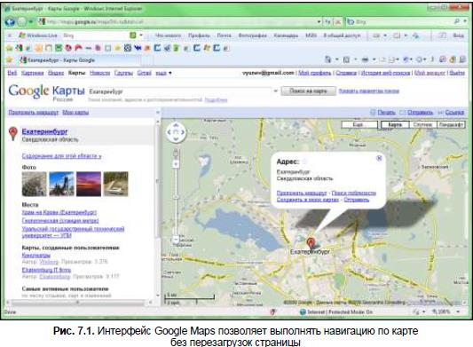 Появление предка XMLHttpRequest можно считать рождением эры Web 2.0, хотя в то время ни такого термина, ни самого наступления новой эры никто не заметил. Потребовалось еще несколько лет, чтобы о технологии заговорили, и был даже придуман специальный термин. Значительное влияние на популяризацию и распространение технологии Ajax оказала компания Google, которая выпустила инновационные и сверхпопулярные в наше время проекты Gmail и Google Maps. Оба продукта Google не предлагали ничего нового: Gmail — это почтовый клиент, а Google Maps — сервис онлайн-карт, подобные которому уже существовали на рынке. Однако изменился сам подход и опыт использования приложений пользователем. Теперь вместо обязательных частых перезагрузок страницы при навигации по письмам или картографическому сервису пользователь получал интерфейс, который напоминал ему обычную настольную программу. Не было перезагрузок страницы с долгим ожиданием, вместо этого данные пользователя незаметно подгружались с сервера Google с использованием Ajax (рис. 7.1).