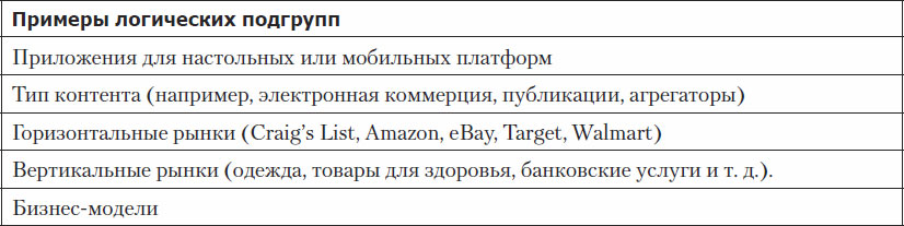 Теперь, когда вы получили общее представление о данных, нужно провести небольшую подготовку для повышения эффективности процесса анализа. В вашем анализе следует сравнить сайты и приложения, у которых есть нечто общее. Яблоки должны сравниваться с яблоками, апельсины – с апельсинами, а мобильные приложения для заказа продуктов – с мобильными приложениями для заказа продуктов. Для этого вам придется вручную отсортировать и разбить конкурентов в списке на подгруппы для практического сравнения.