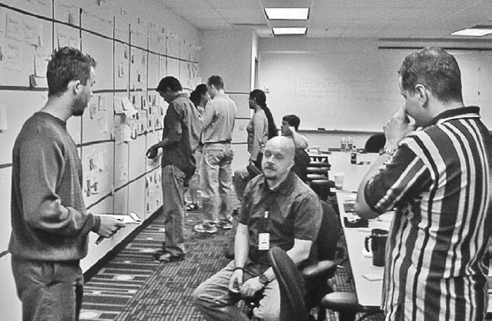 Эти инженеры большой страховой компании потратили много времени на обсуждение находящейся на стене карты. По ходу обсуждения они обнаружили в огромной карте своего продукта небольшую нестыковку: придется изменить обработчик бизнес-правил их продукта. Возможность увидеть картину в целом помогла им визуализировать свою работу несмотря на сложность продукта. Обладая этим знанием, ребята смогут обсудить, что им необходимо запланировать на самых ранних этапах и как минимизировать риски.