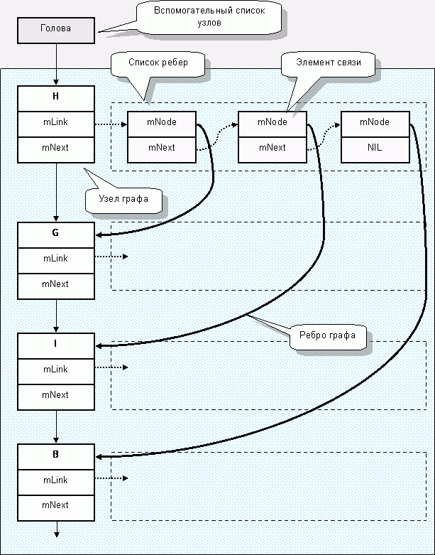 Слева видны тонкие стрелки, ведущие сверху вниз — это вспомогательный список, на который нанизаны узлы графа. Порядок следования узлов в этом списке не важен, важно лишь то, что двигаясь от головы списка по ссылкам mNext, можно достать любой узел. Этот список не определяет зримых связей между узлами.