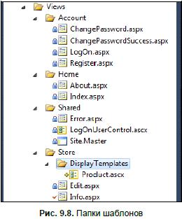 Например, на рис. 9.8 в папке Views/Store представлена папка DisplayTemplates, которая содержит частичное представление Product.ascx. Это означает, что для рендеринга данных типа Product при работе в контроллере storeController будет использоваться шаблон Product.ascx.