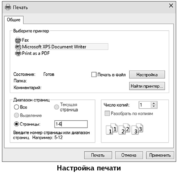 В разделе Диапазон страниц указывается, что нужно напечатать – либо все страницы, либо только ту, на которой установлен курсор, либо определенные номера страниц, либо выделенный фрагмент.