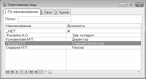 Как видно на рисунке, окно состоит из трех вкладок. На вкладке По наименованию представлен полный список ответственных лиц, на вкладке Свои содержатся только позиции, которым в окне редактирования (рис. 3.12) установлен признак Свой (этот признак устанавливается собственным сотрудникам), а на вкладке Чужие – позиции с признаком Чужой.