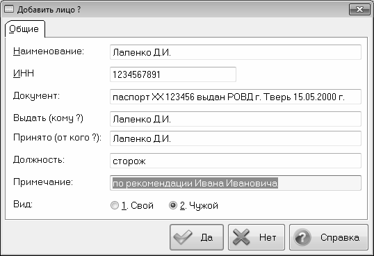 С помощью переключателя Вид определяется, является ли данное лицо сотрудником собственного предприятия либо нет. В первом случае данный переключатель нужно установить в положение Свой, во втором случае – в положение Чужой.