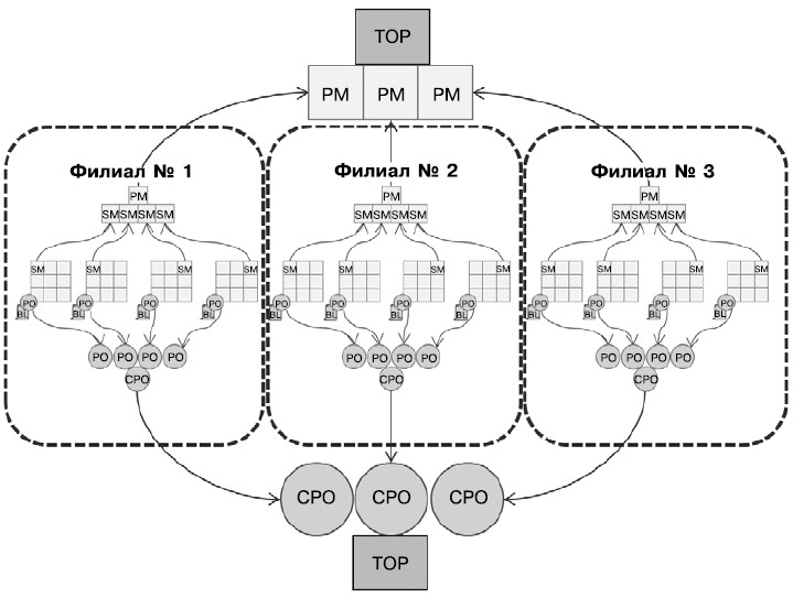 Следует отметить, что вышеописанные схемы подходят для организации распределенной разработки. Для этого необходимо ввести региональные дивизионы и закрепить за ними руководителя программы и главного владельца продукта.