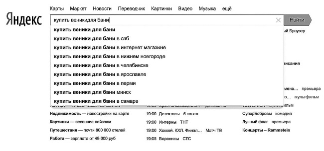 Набираем в поисковике Купить веники для бани. Выпал список из предполагаемых ответов на наш запрос.
