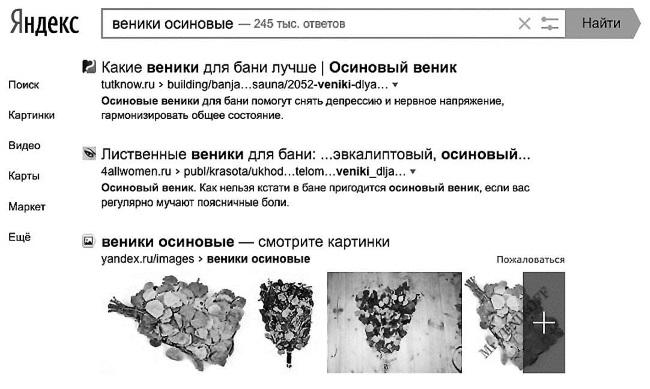 А вот если мы наберем Осиновый веник, то в списке из семидесяти тысяч ответов он есть на второй странице. И на фото в середине мой осиновый веник.