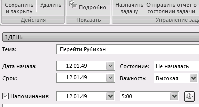 2. Если у задачи есть точный срок исполнения, установите его в поле «Срок». Оповещение по умолчанию установится на 9.00 соответствующего дня. Если вы хотите, чтобы Outlook напомнил вам о задаче раньше, установите в поле «Напоминание» (в Outlook 2003 – «Оповещение») соответствующую дату и время.