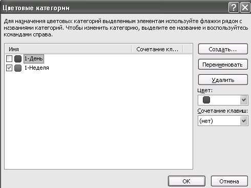 4. В окне «Цветовые категории» нажмите «Создать» и назовите категорию «1-День». Аналогично добавьте категорию «1-Неделя». Затем добавьте все категории, которые вы определили для себя в предыдущем параграфе этой главы.