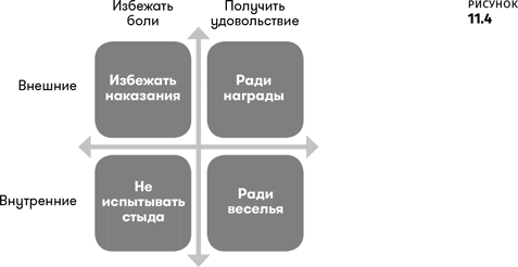 В главе 4 «Игра» мы говорили с вами о том, как изменение отношения может превратить работу в игру и наоборот. Это, несомненно, связано с мотивацией. Вспомните пример с рабочим на фабрике, который создал свою игру, ежедневно пытаясь побить собственный рекорд производства, и как сильно это повлияло на его мотивацию и вовлечение. Но что именно произошло в тот момент? Конечно, можно утверждать, что он получил больше внутренней мотивации. Он меньше концентрировался на внешней мотивации по выполнению своей работы (зарплата) и переключился на что-то более внутреннее: улучшение своего личного рекорда. Он делал то, что действительно хотел делать, поэтому его мотивация стала более личной.