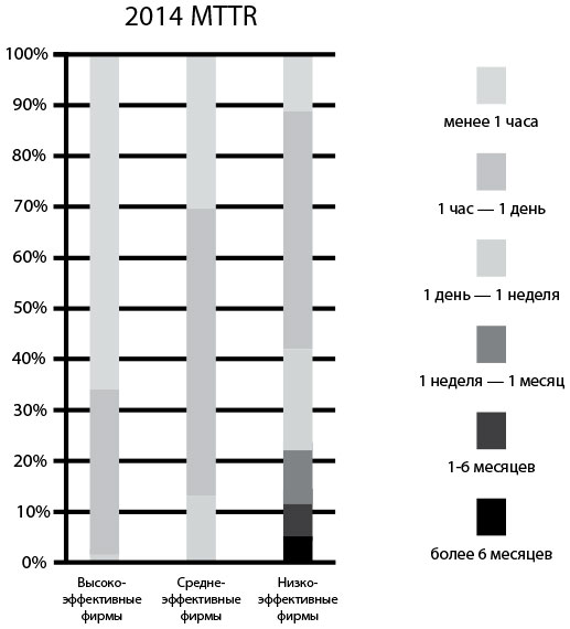 Рис. 25. Время устранения проблемы для высокоэффективных, среднеэффективных и низкоэффективных организаций (источник: отчет 2014 State of DevOps Report компании Puppet Labs)