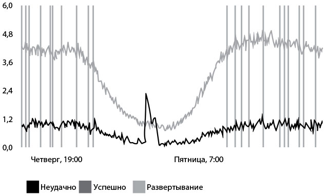 Когда мы будем создавать графики по нашей телеметрии, мы также будем накладывать на них значимые события, возникающие в процессе эксплуатации, потому что нам известно, что большинство проблем на стадии эксплуатации происходит именно из-за эксплуатационных изменений, включая развертывание кода. Это часть того, что позволяет нам сохранять высокие темпы изменений и в то же время поддерживать высокий уровень безопасности системы.