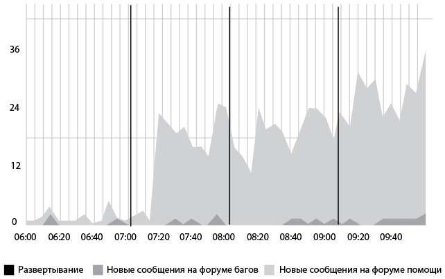 Рис. 28. Активность пользователей в связи с новой функциональностью после развертываний, измеренная в количестве форумных сообщений (источник: Майк Бриттен, “Tracking Every Release”, взято с сайта CodeasCraft.com, 8 декабря 2010 г., https://codeascraft.com/2010/12/08/track-every-release/)