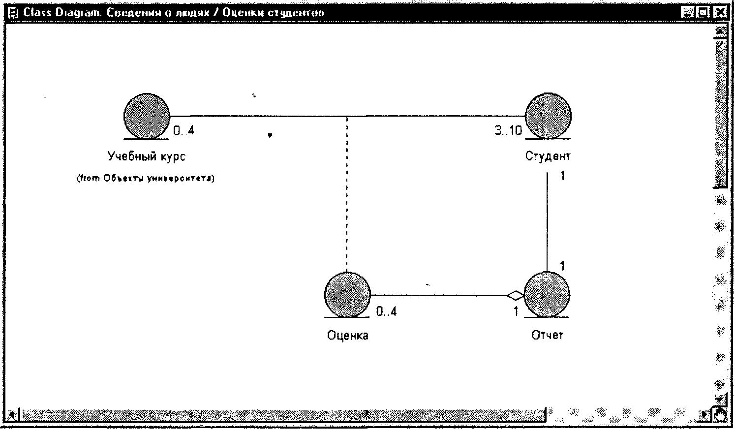 Рассмотрим такой пример. Студент может посещать до четырех учебных курсов, а учебный курс может читаться нескольким студентам — от трех до десяти. Каждый студент получает оценку (grade) за учебный курс. Где должна храниться оценка? Она не принадлежит студенту, так как он наверняка получит различные оценки по разным предметам. Оценка не принадлежит и курсу, потому что студенты получат разные оценки за данный курс. Сведения об оценке принадлежат связи между студентом и учебным курсом. Они моделируются с помощью ассоциативного класса (association class), который ведет себя как и любой другой класс и также может иметь отношения. В нашем примере студент получает отчет об оценках (report card), куда включены связанные объекты оценка.