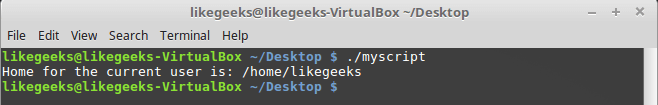 Обратите внимание на то, что мы можем использовать системную переменную $HOME в двойных кавычках, это не помешает системе её распознать. Вот что получится, если выполнить вышеприведённый сценарий.