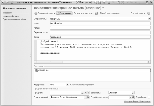 Для немедленной отправки электронного письма нажмите в инструментальной панели данного окна кнопку Отправить или комбинацию клавиш Ctrl+Enter. Чтобы, не отправляя, сохранить письмо для последующего просмотра и редактирования, нажмите кнопку Записать и закрыть – после этого оно отобразится в окне списка взаимодействий (см. рис. 3.8).