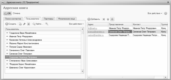 Как видно на рисунке, данное окно состоит из двух частей, причем левая часть включает в себя несколько вкладок. Первое, что нужно сделать – это открыть вкладку, на которой вы будете выбирать адресатов электронного письма (выбор может осуществляться из справочников пользователей, партнеров и физических лиц). Для поиска контакта (например, если вы не помните, в какой справочник он был внесен, или просто затрудняетесь его найти) используйте вкладку Поиск контактов.