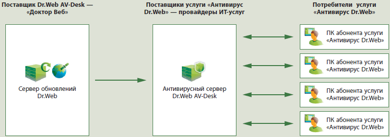 Предоставление ПО как услуги у многих российских ИТ-специалистов ассоциируется с CRM-системами. Безусловно, определенную популярность такие решения приобрели, однако в большей степени SaaS в России ассоциируется с разработкой компании «Доктор Веб», известной своими решениями, обеспечивающими антивирусную защиту. Интернет-сервис Dr.Web AV-Desk, появившийся в конце 2007 г., – это ПО, позволяющее прежде всего Интернет-провайдеру (и компаниям, предлагающим ИТ-услуги) централизованно управлять процессом предоставления антивирусной защиты своим абонентам.