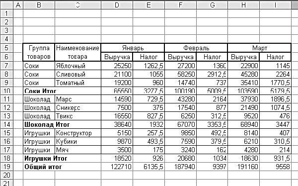 Приступим к расчету промежуточных и общих итогов – это позволит нам увидеть объем выручки и исчисленного налога по каждой группе товаров, а также общий объем выручки и налога в каждом месяце.