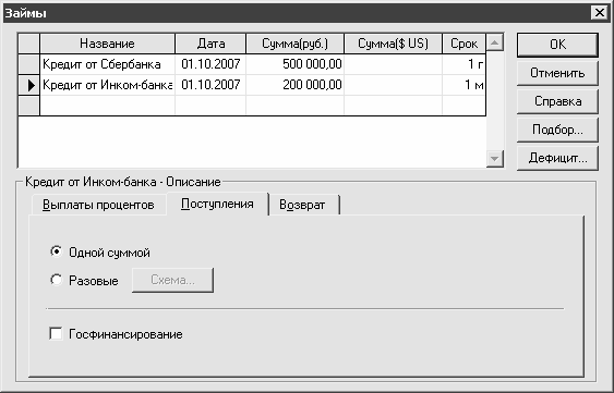 Верхней части данного окна формируется список привлеченных кредитов и займов, в нижней части осуществляется подробное описание каждого кредита или займа. Нижняя часть окна состоит из трех вкладок: Выплаты процентов, Поступления и Возврат, причем содержимое каждой вкладки относится к тому кредиту (займу), на котором в верхней части окна установлен курсор.