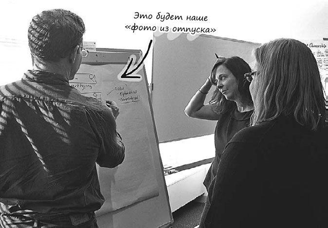 Если вы пишете на бумаге, прихватите ее с собой и заглядывайте в нее позднее. Если записи сделаны на стене, можно просто обращаться к ним по мере надобности. Кроме того, если вы общаетесь как настоящая команда, то обнаружите, что вам не нужно беспрестанно все повторять. Люди и так будут помнить подробности обсуждения, особенно если вы сопровождали его документами и простыми рисунками… теми самыми «фото из отпуска».