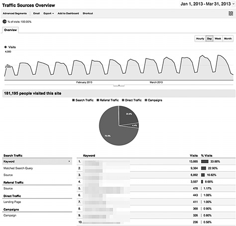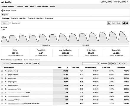 Рис. 5.1. Это иллюстрация примеров записи источников трафика, которые Google Analytics может для вас делать. Он даже показывает, по каким поисковым словам и фразам и как часто люди вас находят. Вы можете использовать эту информацию для оптимизации. Это одна из тысяч характеристик, которые бесплатно доступны в Google Analytics