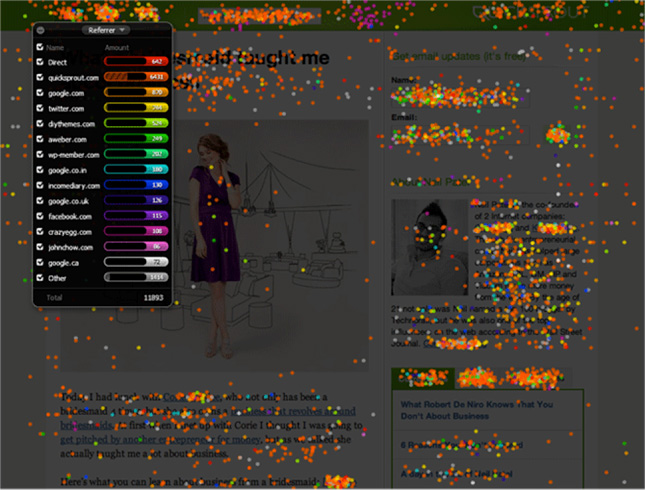 Crazy Egg может собрать прекрасную информацию, даже если у вас небольшой трафик. Это один из моих любимых инструментов для выявления того, что в действительности делают посетители, оказываясь на вашем сайте. Вы можете выяснить, что они видят и чего не видят, куда кликают и т. д. Эта программа записывает клики вплоть до перехода на сайт (individual links) — то, чего Google Analytics не умеет. Она также делит ресурсы трафика на сегменты так, что вы можете наблюдать, какие потоки трафика конвертируют лучше других. Crazy Egg предоставляет доступные отчеты, поэтому создавать новые идеи становится проще. У нее есть дочерняя компания — KISSmetrics, занимающаяся серьезной веб-аналитикой, A/B-тестированием и различными свойствами воронки конверсии.