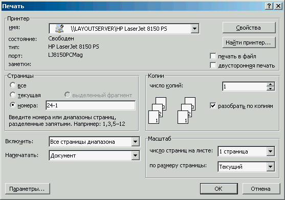 Альтернативный подход для Word – настроить программу на печать диапазона в обратном порядке. Например, для печати 24-страничного файла в Word 2003 можно не искать флажок Reverse Print Order, а просто выбрать команду File | Print (Файл | Печать) и в текстовом поле Pages (Страницы) настроить Word на печать страниц 24–1.