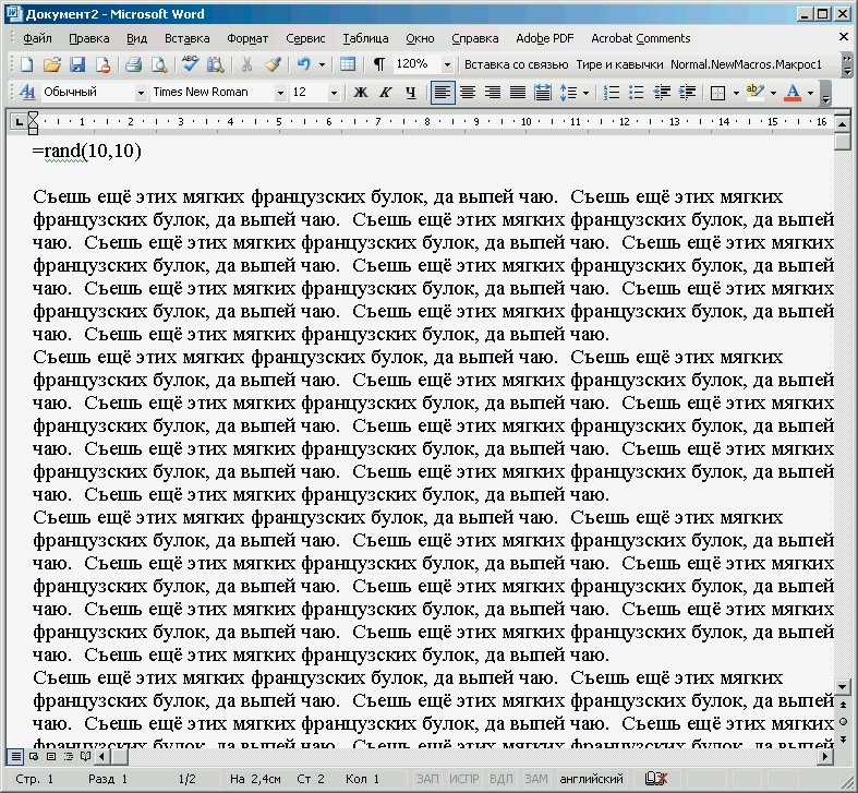 Часто бывает удобно составить текстовый документ в Word, например для тестирования функции печати или форматирования. Чтобы быстро подготовить необходимый объем текста, просто введите =rand(p,s) в отдельном абзаце, где p – это нужное число абзацев, а s – число предложений в каждом из них. Затем нажмите клавишу Enter. В Word 2003 и более ранних версиях формируется текст с использованием предложения The quick brown fox jumps over the lazy dog. В Word 2007 используется другой текст, но если вы предпочитаете предшествующие версии, примените команду =rand.old(p,s). В Word 2007 есть и такой вариант образцового текста: команда =lorem(p,s).