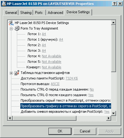 Настройки параметров печати с использованием языка PostScript можно найти в дополнительных параметрах драйвера принтера